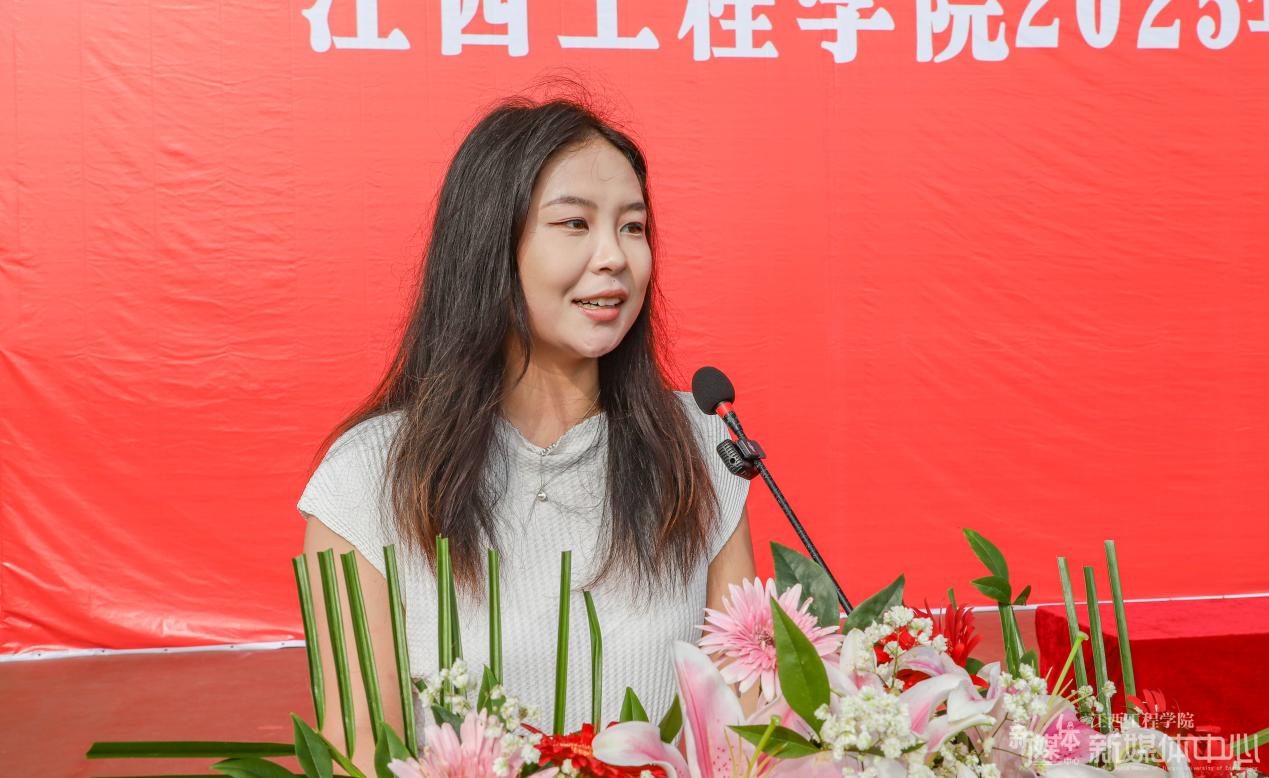 抱石艺术学院水佳楠作为教师代表发言。她结合自身的经历,向新生强调“勤朴敏信”的校训精神传承,体现在一代代江工人的选择与坚守之中。她希望新生珍惜在江工的每一天,主动探索、知行合一、创新致用,身心强健,让青春在为祖国、为人民、为人类的不懈奋斗中绽放绚丽之花。
